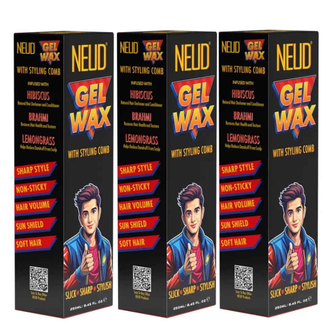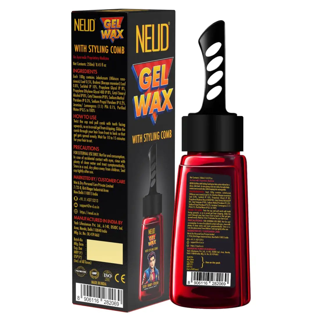 Buy NEUD Hair Gel Wax 250ml with in-built styling comb and get set to adorn the hair style you love. This premium Ayurvedic hair styling gel is suitable for straight hair, wavy hair and curly hair in men and women. NEUD hair gel is infused with hibiscus which is a natural hair darkener and conditioner. Brahmi in this styling wax helps boost hair texture and hair health. Lemongrass gives an invigorating and refreshing smell to this volumizing hair wax, and also promotes scalp care by fighting dandruff.
