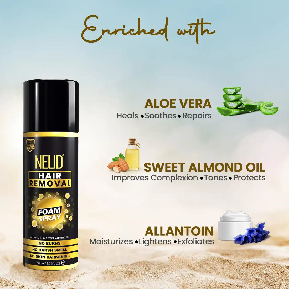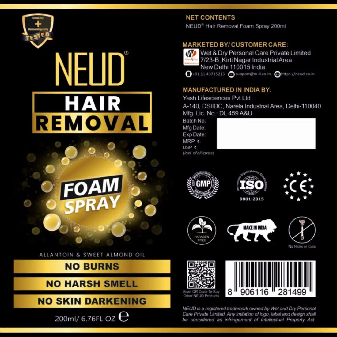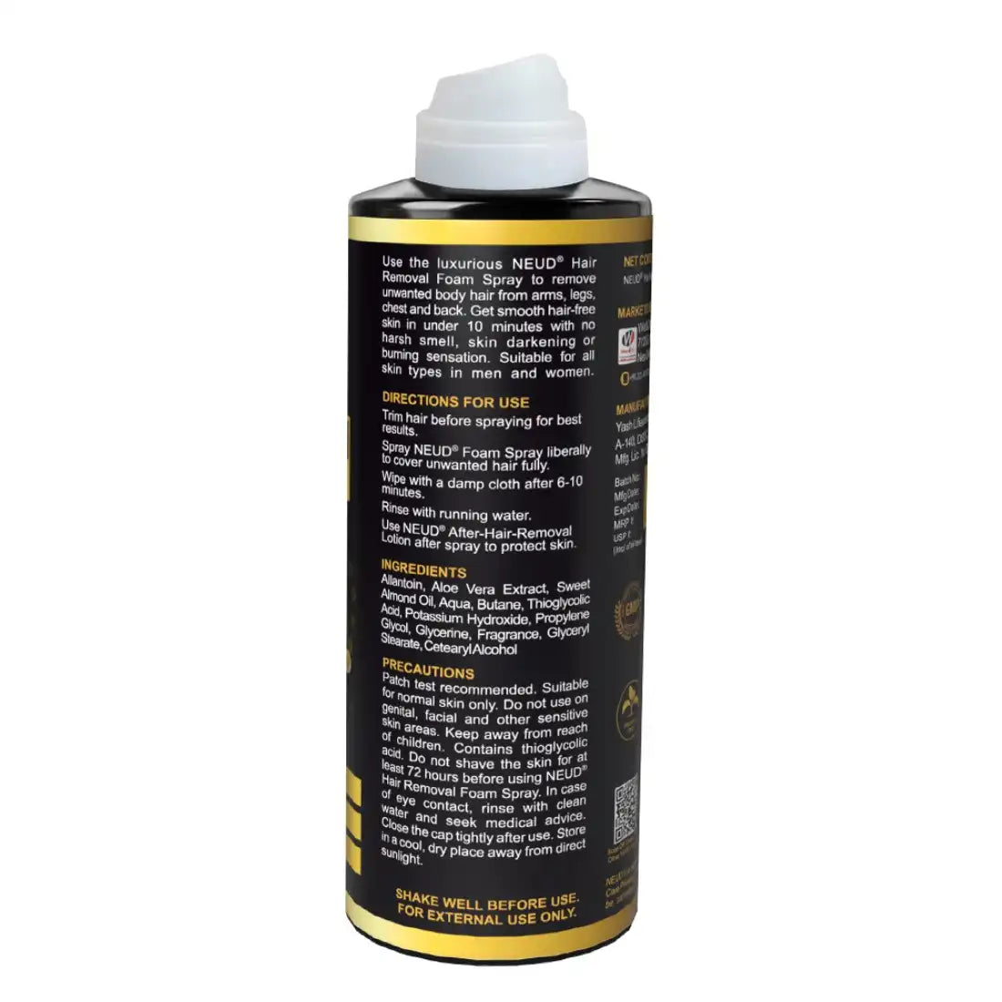 Enriched with allantoin, sweet almond oil and aloe vera, NEUD Hair Removal Foam Spray does not cause any burning sensation, or skin darkening. Its unique formula also does not give you any harsh obnoxious smell. This paraben-free top-certified premium product has been proudly made in India at a GMP, ISO and CE-approved facility.