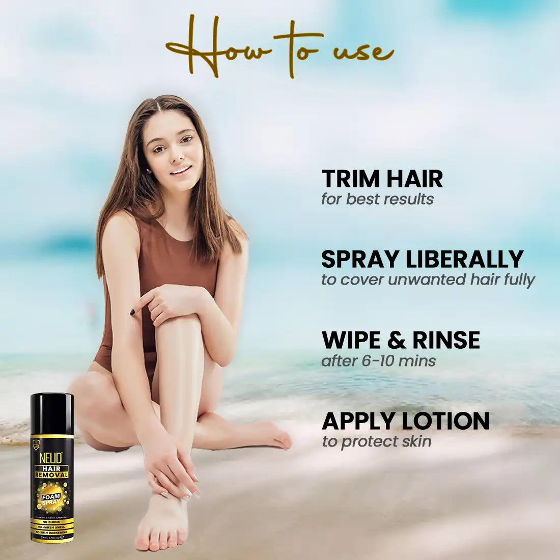 Trim hair before spraying for best results. Spray NEUD Hair Removal Foam Spray liberally on the skin to cover unwanted hair fully. Wipe with a damp cloth after 6-10 minutes. Rinse with running water. Use NEUD After-Hair-Removal Lotion after using spray to nourish and protect skin.
