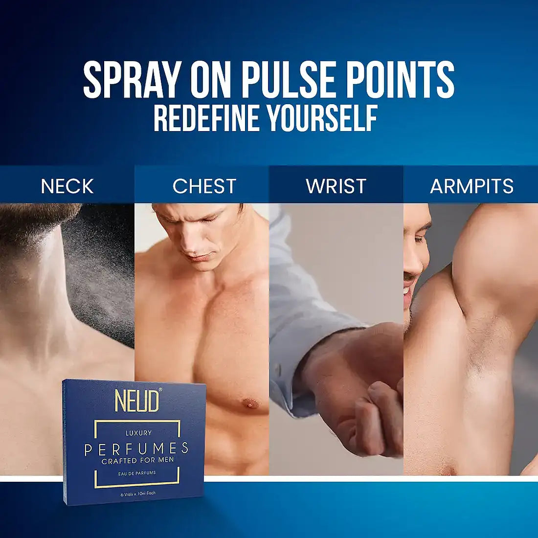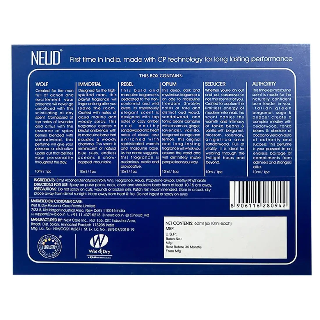 NEUD offers six exciting luxury perfumes for men made with advanced CP technology for a super long-lasting performance, brilliance and clarity. Each combo set contains six 10ml vials of opulent and lavish Eau De Parfums. With up to 85 full spritzes in each vial, you get over 500 total spritzes of fragrance in every set.
