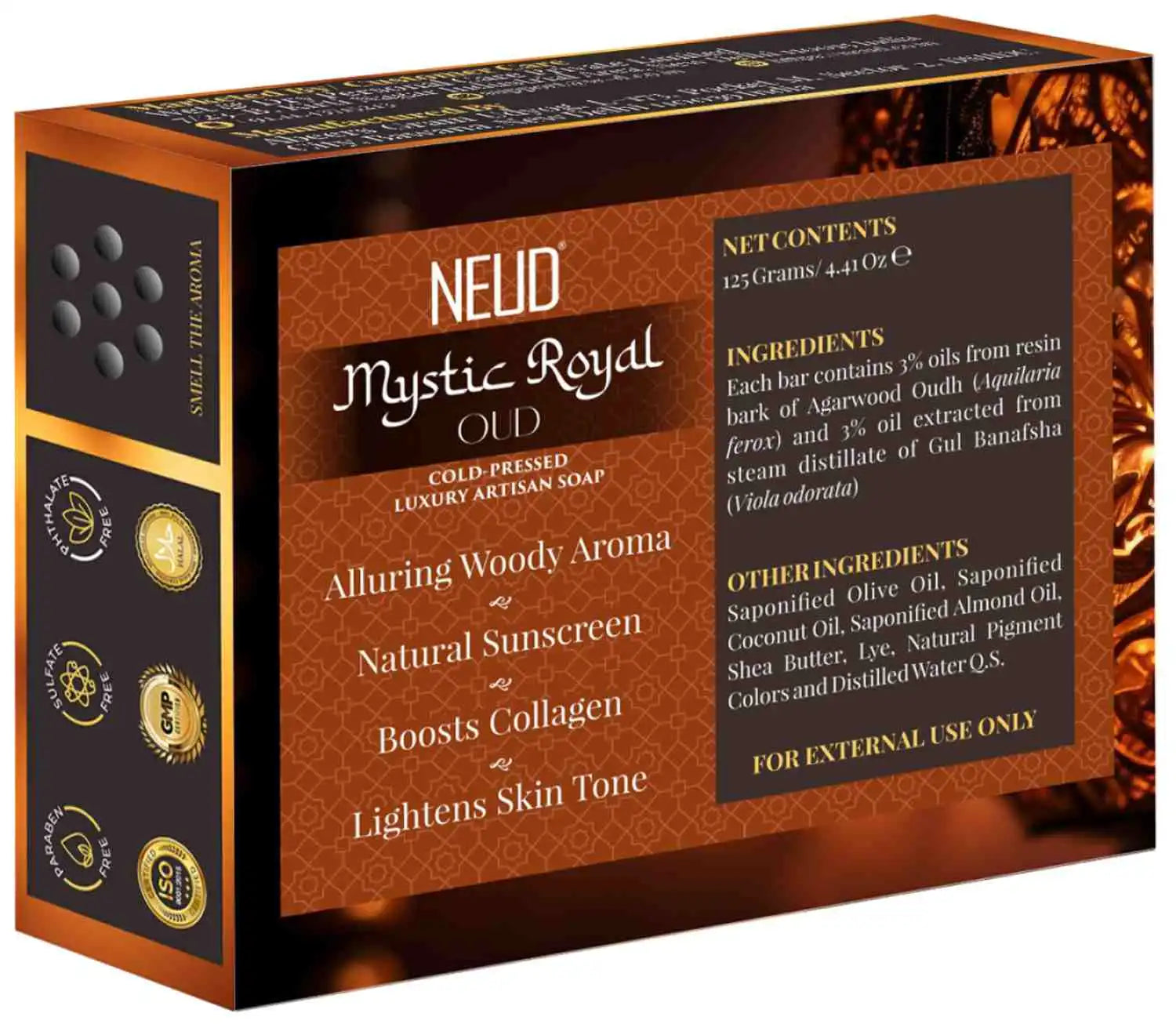 NEUD Mystic Royal Oud Luxury Artisan pH Balanced Cold-Pressed Handmade Soap 125g With Oudh and Gul Banafsha