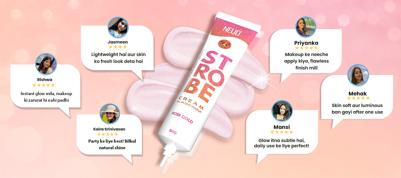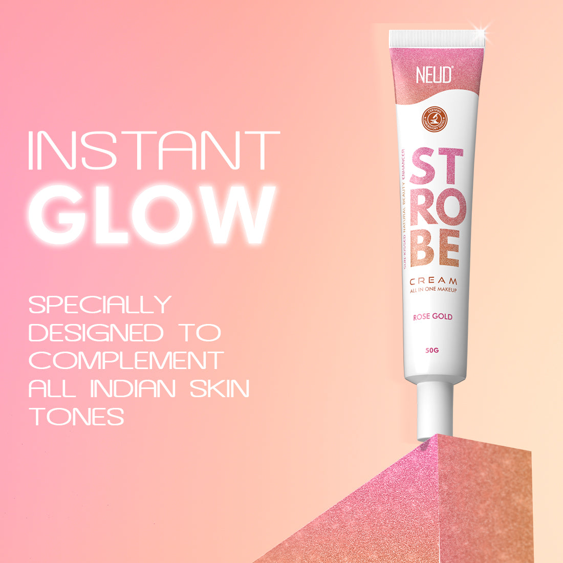 NEUD Strobe Cream has a rose-gold tint that blends seamlessly for a long-wear all-day HD finish and is ideal for complementing all Indian skin tones.